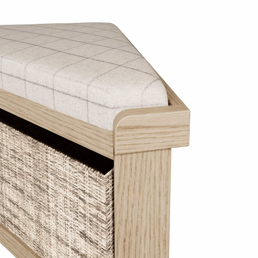 Add classic charm and extra hallway storage with this solid wood entryway bench, featuring a luxurious wool seat and hand-woven wicker basket.