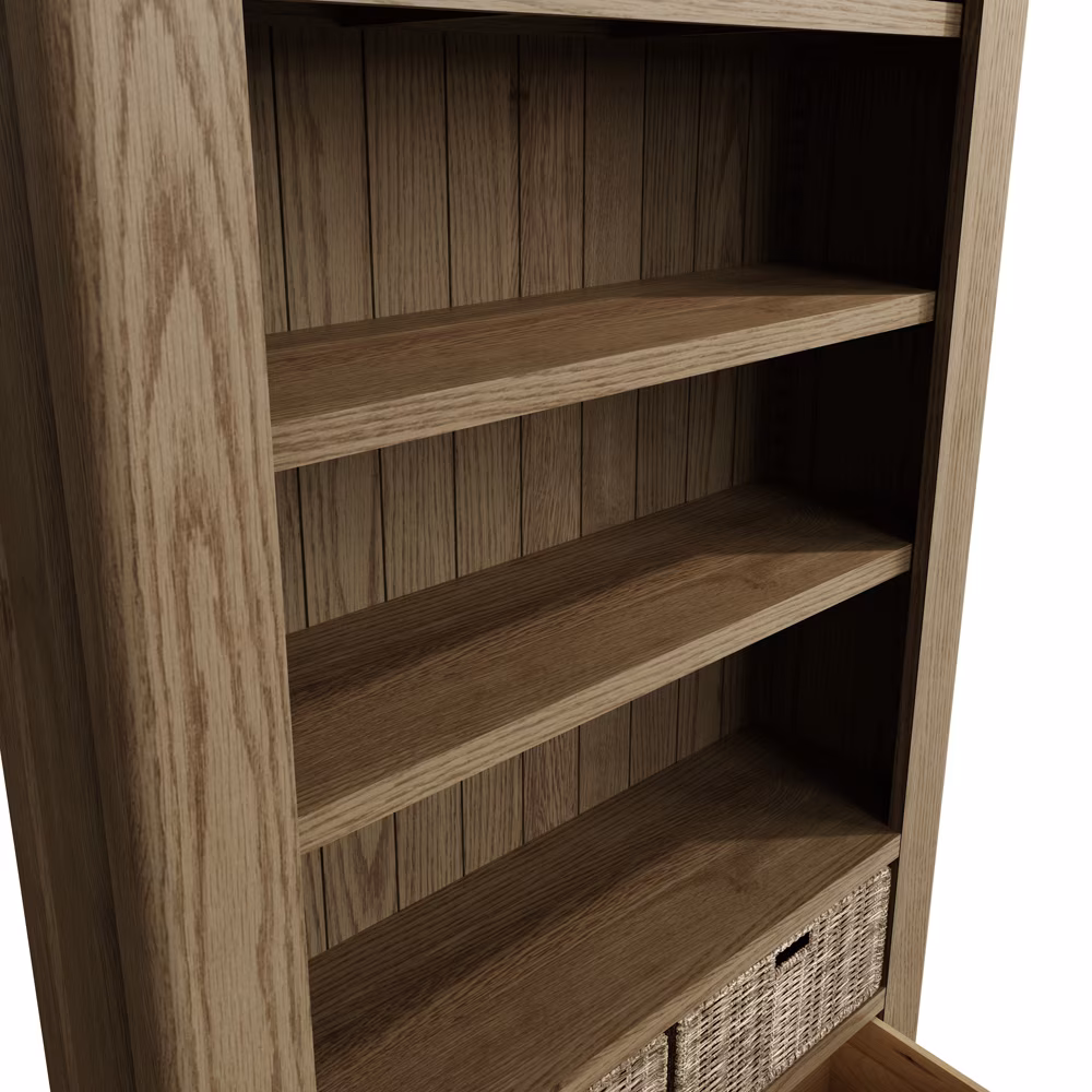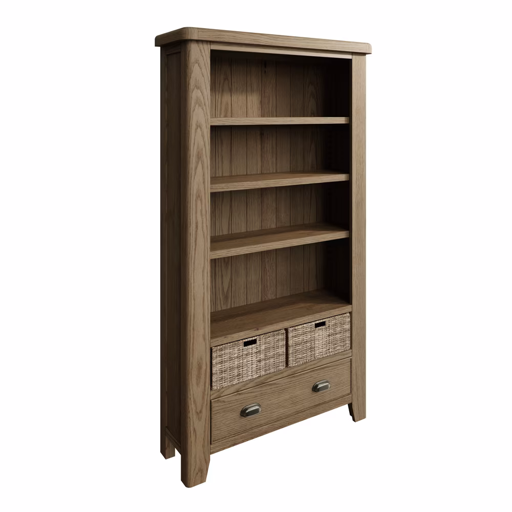 Discover versatile smoked oak shelving with the Highgate Large Bookcase, a substantial wood storage solution featuring solid craftsmanship and rustic wicker accents for every living space.