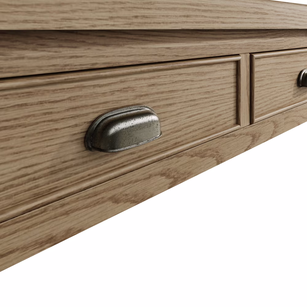 Experience timeless sophistication with this large smoked oak lounge table, expertly crafted with a solid wood frame, four dovetailed storage drawers, and a robust chunky oak top – perfect for stylish, practical living spaces.