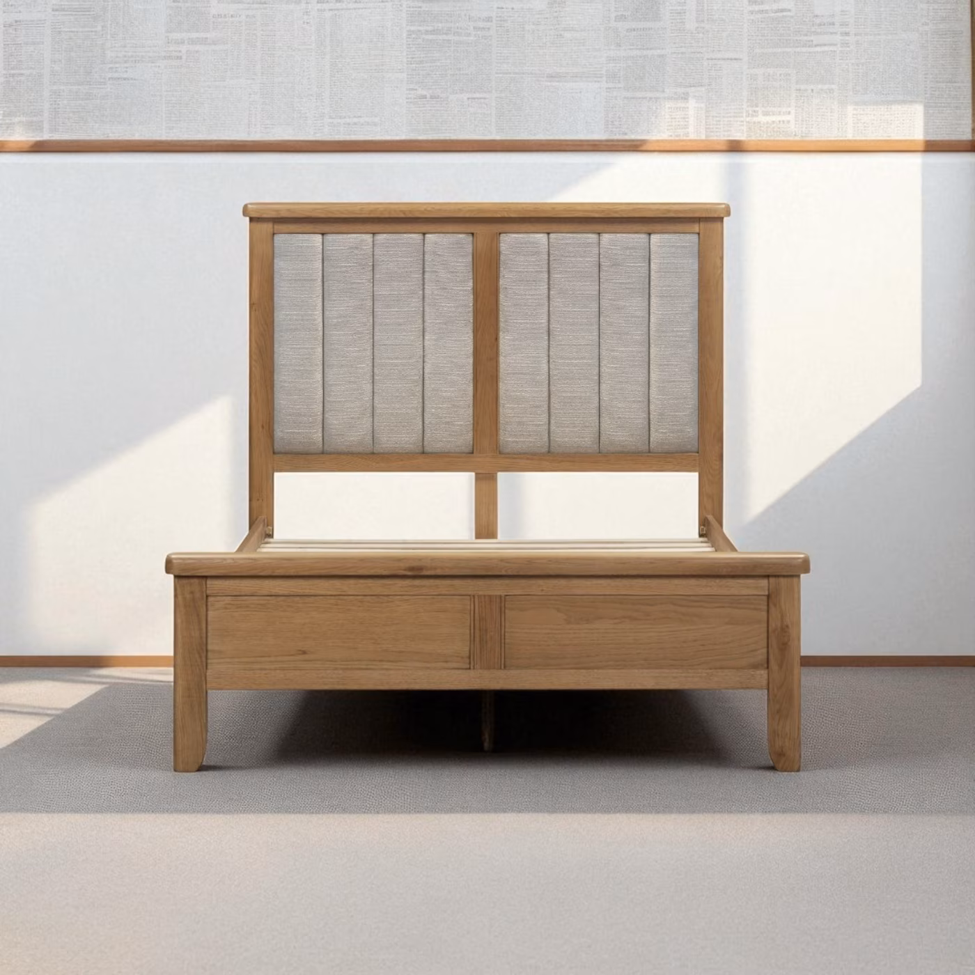 Sophisticated handles, refined oak grain, and a smooth, tactile finish complement the upholstered headboard, making this bed an effortlessly stylish centrepiece with timeless appeal.