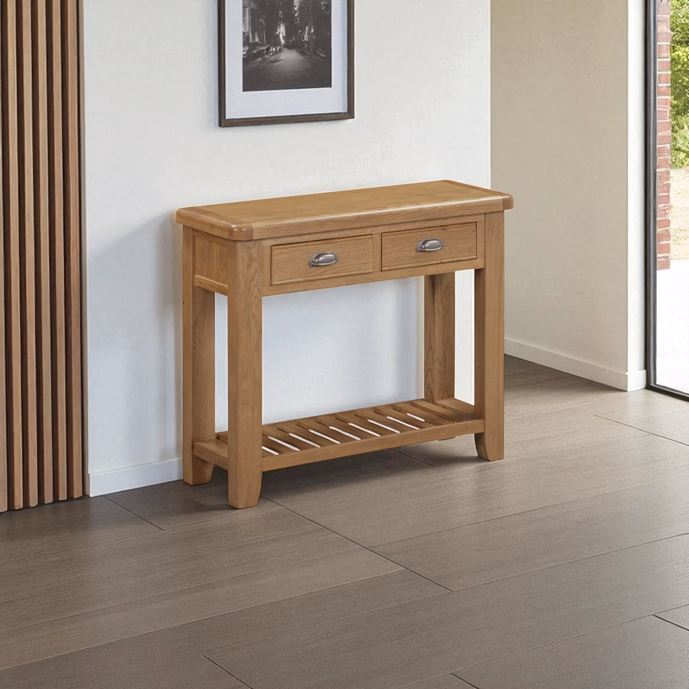Showcasing a sophisticated blend of natural oak tones and contemporary design, the Hopwood Console Table delivers refined style alongside practical surface space for your hallway or living area.