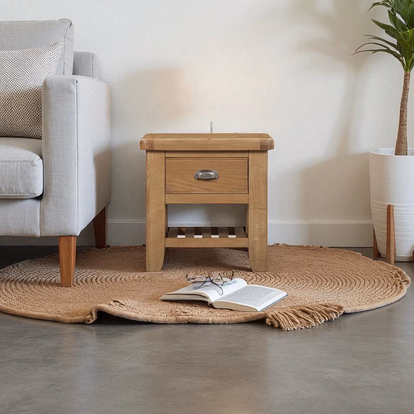 This elegant lamp table features a sumptuous Smoked Oak finish, enhancing the warmth and character of natural oak while adding a touch of contemporary sophistication to your living space.