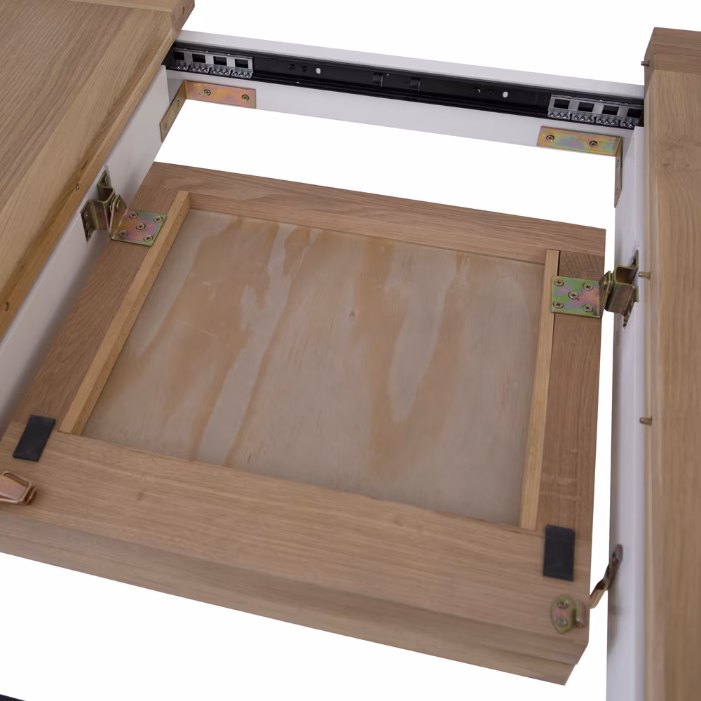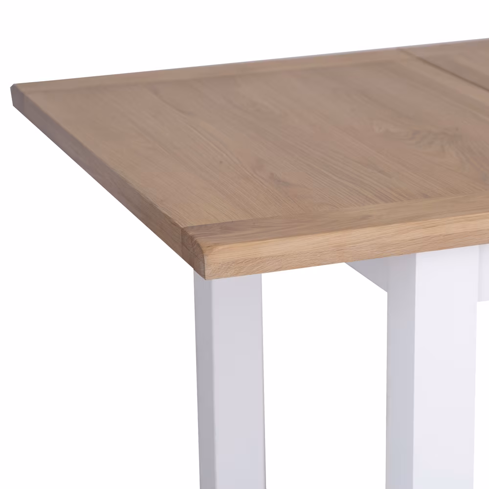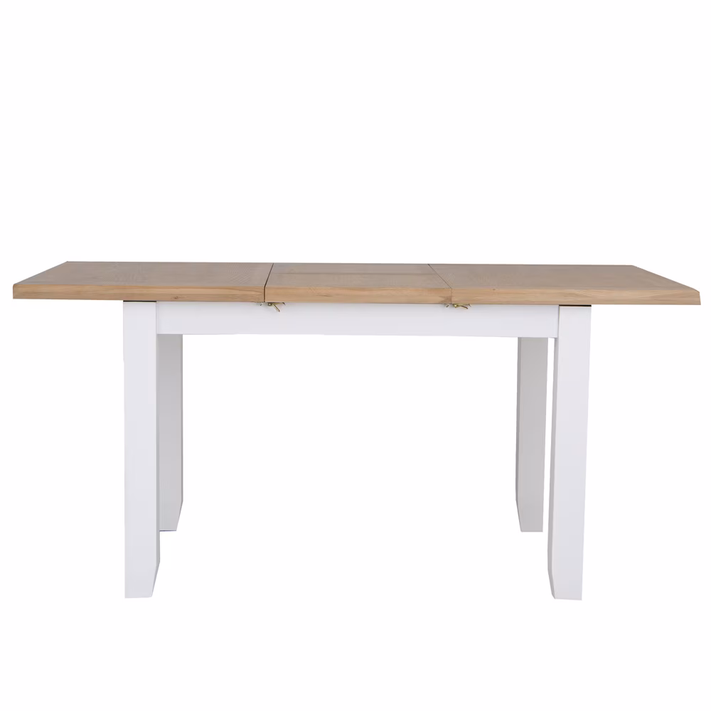 Snow White and Light Oak extending dining table featuring a smooth butterfly leaf mechanism – the perfect space-saving solution for your dining area.