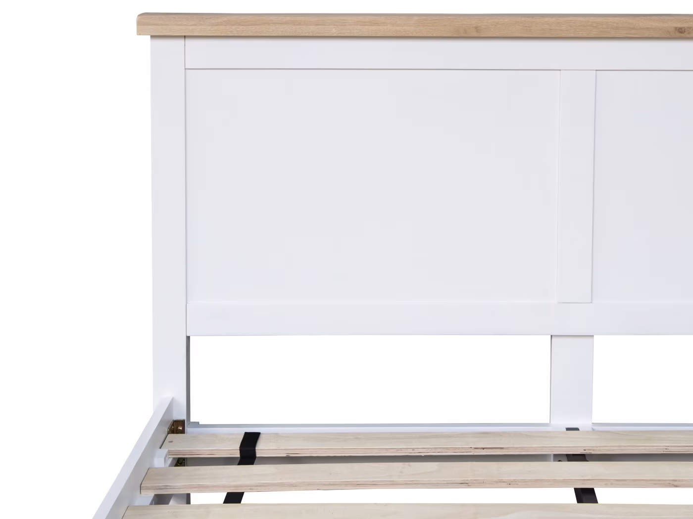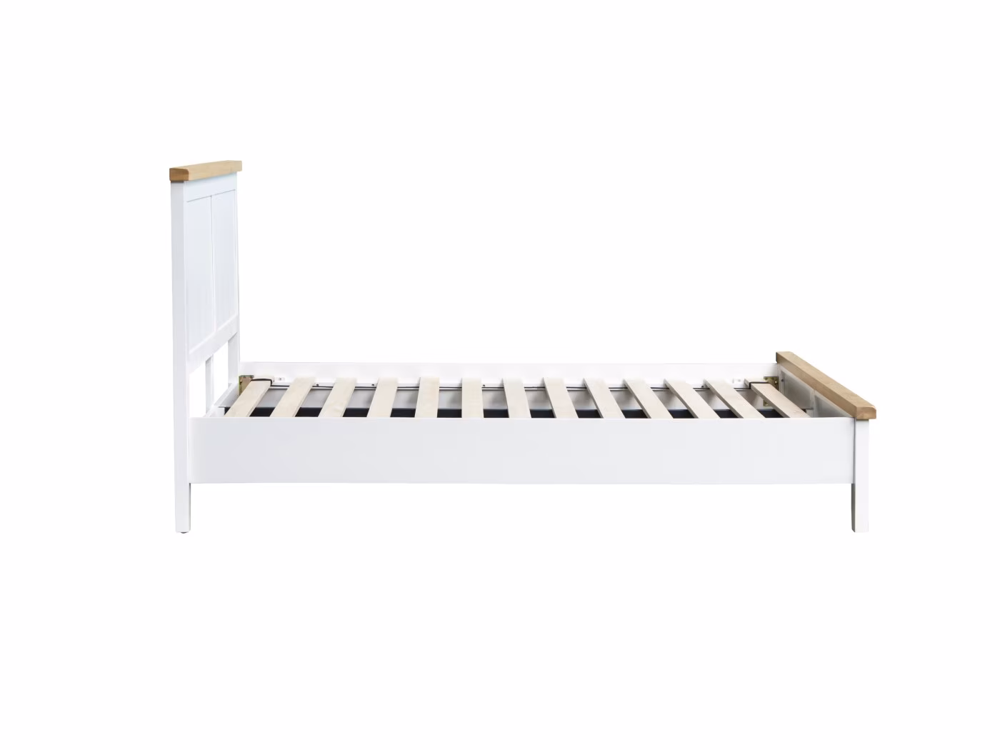 Transform your bedroom with this stylish 5ft wooden bed frame, a robust alternative to standard beds, featuring a snow white and light oak painted finish from the New Cotswold collection.