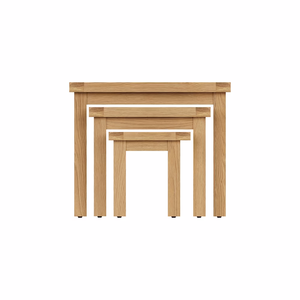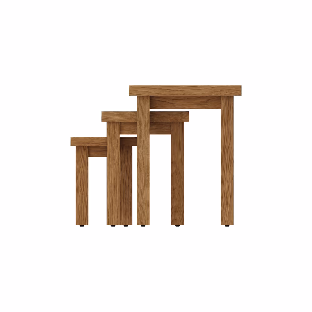 Transform your living room with this elegant set of three nesting tables in a warm medium oak finish.