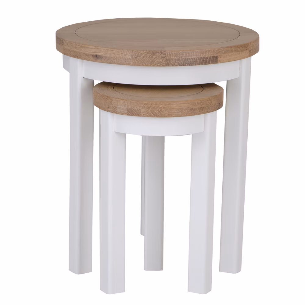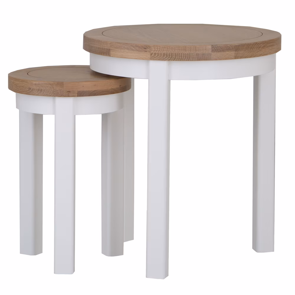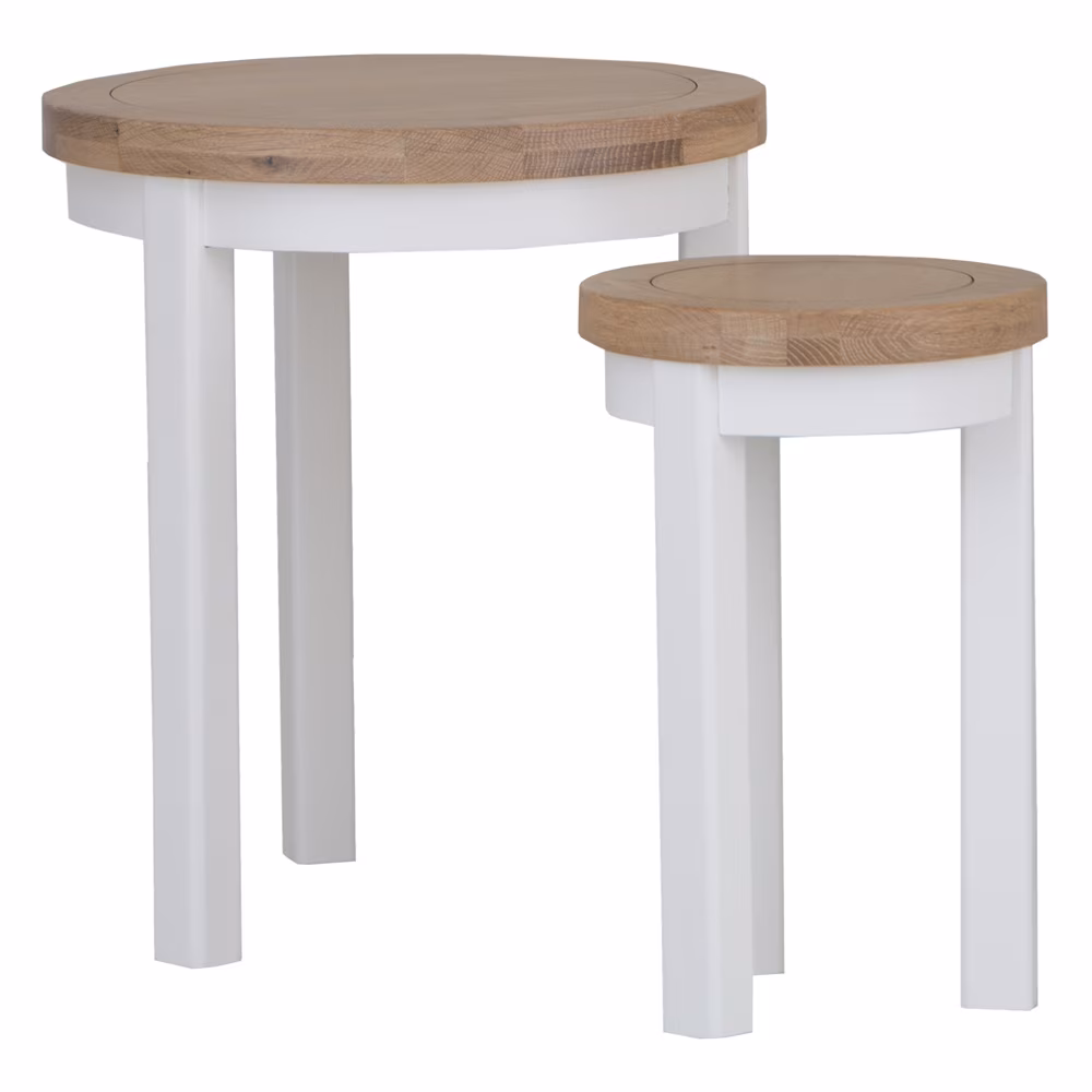 Elevate your space with the New Cotswold round nest of 2 tables in snow white and light oak.