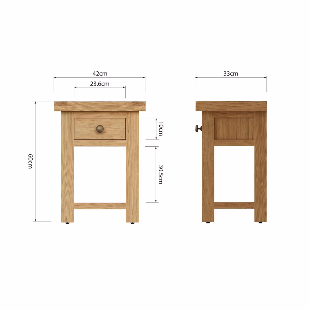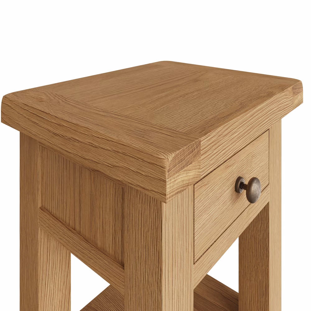 Add timeless charm to your living space with this versatile oak side table, featuring a dovetailed drawer, storage shelf, and antique brass-effect handle – perfect as a lamp stand or compact end table.