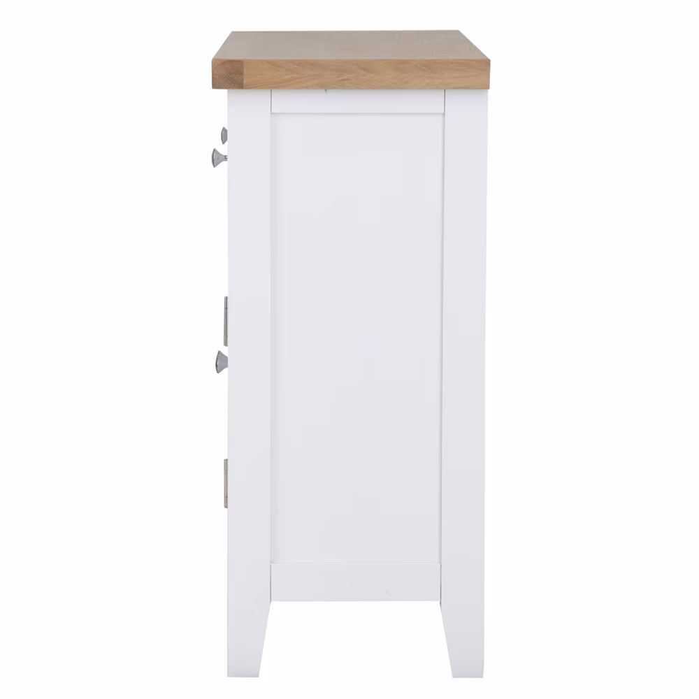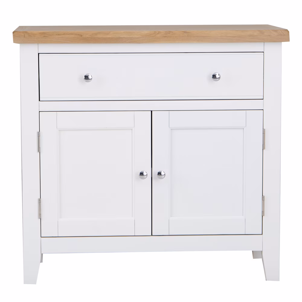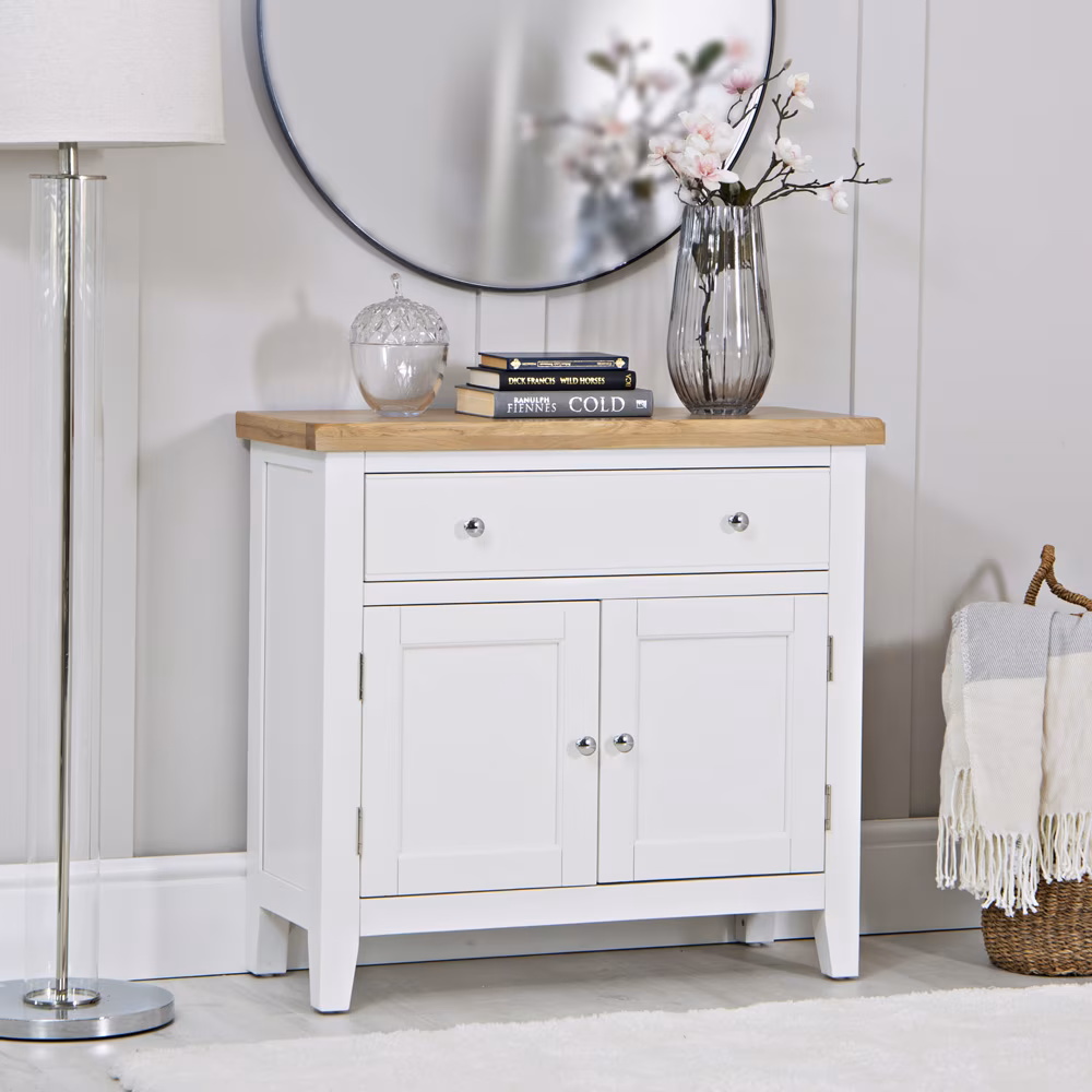 Upgrade your living space with this elegant compact cupboard – the perfect contemporary white and oak buffet storage for any modern home.